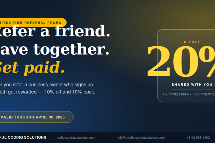 Agency Agency April 27, 2026 0 Comments Until April 30th: refer me a business owner who signs up and you get 10% of their first month Limited-Time Referral Promo Send a friend. Save together. Get paid. Refer a business owner who signs up with Mindful Coding Solutions and we’ll thank both of you with 10%...